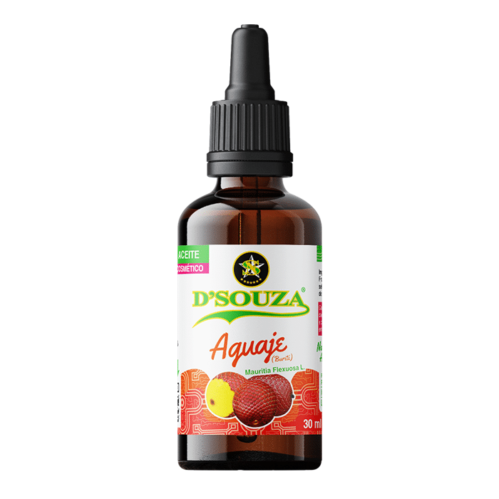El Aceite cosmético de Aguaje o Buriti Amazónico, es rico en fitoestrógenos, vitaminas y minerales. Sus principales componentes son el beta caroteno (Provitamina A), tocoferoles (Vitamina E), y ácido ascórbico (Vitamina C) y presenta una gran estabilidad frente a la oxidación.